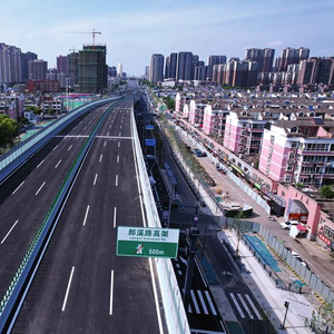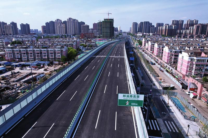 在郎溪路与临泉路交口附近,顺着郎溪路方向向南看去,新建好的高架桥已经屹立在道路中央,桥面沥青已摊铺完成,所有声屏障也已安装到位,两侧的桥下地面道路也已建设一新,所有的标识标线均已安装、施画到位,只等正式放行的通知。