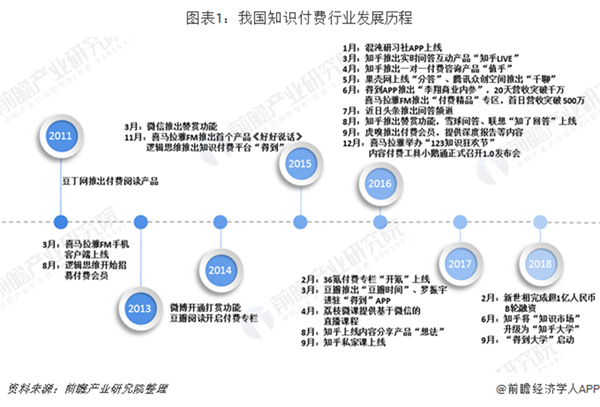 2016年被称为中国知识付费的元年,从这一年开始知乎、得到和喜马拉雅FM等平台陆续推出了知识付费平台,知识付费用户也是从这一年开始迅速增长。其实,早在2011年豆丁网就已经布局知识付费行业,突出付费阅读产品。2013年喜马拉雅FM上线,逻辑思维已经开始招募付费会员。经过几年的发展,现在我国知识付费行业总体上已经形成了较为成熟的产业链,各大主流知识付费平台也逐渐拥有了较为稳定的盈利模式和自身的头部产品。