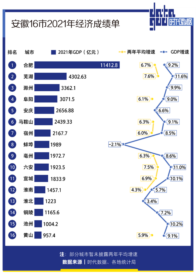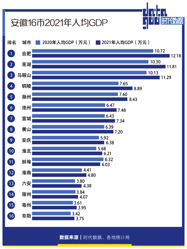 原标题:安徽16市2021年经济成绩单:合肥GDP全省第一,8城人均GDP超1万美元