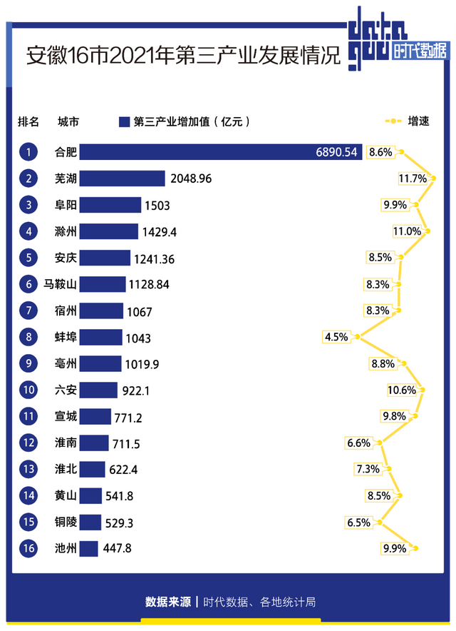 从第三产业增加值来看,合肥第三产业增加值达到6890.54亿元,高居全省第一;其后,芜湖以2084.09亿元的第三产业增加值位居第二;阜阳以1503亿元的第三产业增加值位居第三。