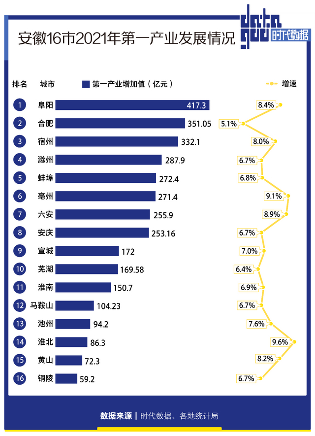 从第一产业增速来看,淮北、亳州、六安位居全省前三,增速分别为9.6%、9.1%、8.9%。