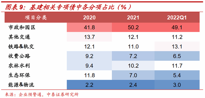 基建相关专项债中,铁路&轨交、农林水利、能源&物流是今年发力重点。在投向基建的专项债资金中,市政园区占比最大,2021年全年超过一半。值得注意的是,今年一季度,铁路&轨交、农林水利、能源&物流等3个投向的占比相对去年均有明显上升,同时,收费公路、生态环保等占比则延续下降趋势。在防范化解隐性债务风险背景下,补短板可能更多需要向有一定收益、更能吸引社会资本的领域倾斜。