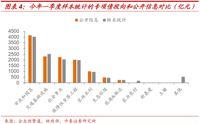 1)基于项目的专项债统计方法关键在于界定好分类标准,我们的样本统计量和实际发行量接近,而且和一季度官方披露的投向情况基本一致,该方法具备连续性和时效性两大优势。