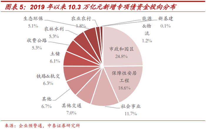 10.3万亿专项债资金主要用于10个投向。2019年以来,新增专项债的13个具体投向中,占比超过5%的有10个。其中排名第一的是市政和园区(24.8%、25549亿元),其次是保障性安居工程(18.6%)和社会事业(11.7%),其他超过5%的领域还有其他交通(7.0%)、其他(6.7%)、铁路&轨交(6.3%)、土储(6.1%)、收费公路(5.3%)、农林水利(5.3%)和生态环保(5.1%)等。