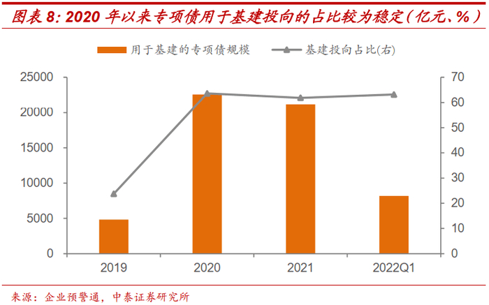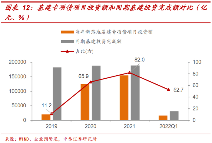 基建投资对于专项债项目的依赖度大幅上升。我们的项目统计除了关注专项债资金使用情况,还会梳理项目总投资额情况。因此我们可以将每个时期基建专项债对应的项目总投资额加总,再按照项目建设期(假设平均2年)计算当期落地的投资额,并和同期公布的基建投资完成额进行对比。2019年这一比值只有11.2%,随着专项债监管趋严、地方财政收支平衡压力增大,“开前门”力度不断加大,2021年比值上升到82%,今年一季度也有52.7%。换言之,今年一季度每完成1亿元基建投资,其中有5270万是新增专项债项目带来的。因此,从基建投资预测角度看,跟踪基建专项债发行和项目投资落地情况,是一个比较好的领先指标。