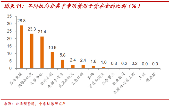 专项债用作资本金集中在交通、农林水利等领域。2019年9月,财政部将专项债券可用作项目资本金范围由原有四个领域项目扩大为十个领域[1],主要是交通、能源、物流、水利、环保等投向。2019年以来我们统计的10.3万亿新增专项债中,用作资本金的规模为5961亿,占比5.8%。用于交通领域的比例最高,包括其他交通(28.8%)、铁路&轨交(23.3%)、收费公路(21.4%),其次是农林水利(10.9%)。