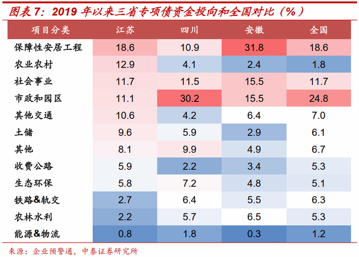 分地区看,东部投向较均衡、中部主要靠保障房、西部重点是市政和园区。我们逐一分析了31省市每个月新增专项债投向和重点变化,限于篇幅,这里仅选取发行量较大的三个省作为代表:东部的江苏、中部的安徽、西部的四川。对比来看,不同省市专项债投向存在较大差异:江苏主要投向分布较为均衡,保障性安居工程、社会事业和全国占比一致,农业农村领域占比更高,市政和园区方向占比相对偏低;四川重点投向市政和园区领域,其次是社会事业和保障性安居工程;安徽则以保障性安居工程为主,此外社会事业占比高于全国水平。
