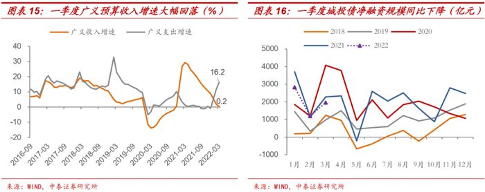 专项债支撑减弱,谁来接力?4月份以来新增专项债发行节奏明显放缓,市场对于基建投资持续性存在疑虑。在假设5-6月专项债发行再次提速的情况下,二季度起,每月基建专项债资金落地规模预计仍维持较高水平,但由于去年基数逐渐升高,同比角度看支撑作用可能减弱。随着全年稳增长压力进一步上升,对于基建托底的强度和持续性提出了更高的要求。一季度广义财政收入增速降至0.2%,地方政府财政收支平衡难度加大。同时,在防范化解隐性债务风险政策背景下,一季度城投债发行量和净融资规模同比双双走弱。为避免专项债“独木难支”,积极财政存在进一步加码的必要性。