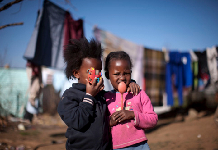 在约翰内斯堡(南非)莫特斯瓦雷迪临时定居点,4岁的阿曼达(左)和努努拿着她们刚刚找到的新玩具:一个破坏了的玩具小车和一把塑料小勺