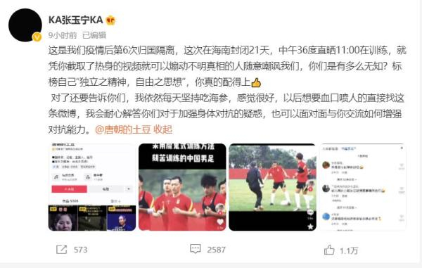 张玉宁写道:“这是我们疫情后第6次归国隔离,这次在海南封闭21天,中午36度直晒11:00在训练,就凭你截取了热身的视频就可以煽动不明真相的人随意嘲讽我们,你们是有多么无知?标榜自己“独立之精神,自由之思想”,你真的配得上!”