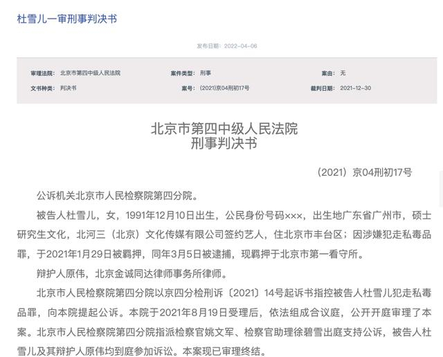 北京市第四中级人民法院刑事判决书显示,被告人杜雪儿,女,1991年12月10日出生,公民身份号码xxx,出生地广东省广州市,硕士研究生文化,北河三(北京)文化传媒有限公司签约艺人,住北京市丰台区;因涉嫌犯走私毒品罪,于2021年1月29日被羁押,同年3月5日被逮捕,现羁押于北京市第一看守所。