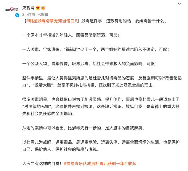 4月26日,央视网就福禄寿乐队成员杜雪儿涉毒评:涉毒这件事,道歉有用的话,要缉毒警干什么。