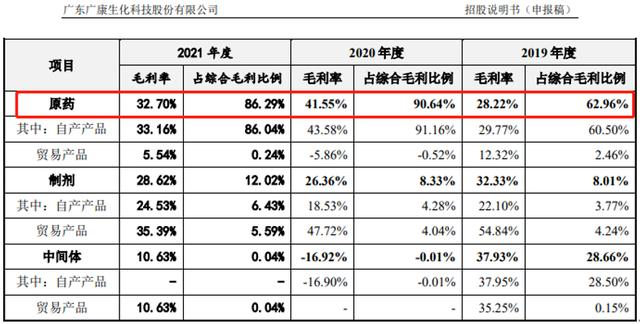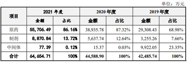 根据招股说明书申报稿,2019年、2020年、2021年,公司原药收入分别为占主营业务收入的68.98%、87.32%、86.16%。