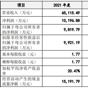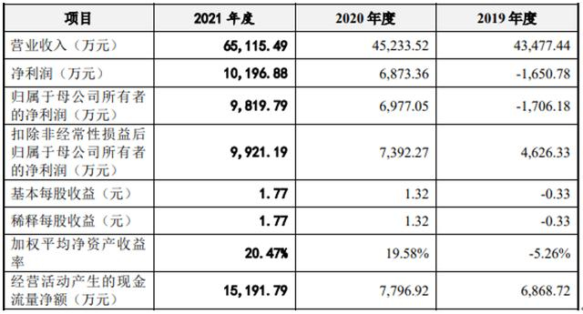 2019年、2020年、2021年,广康生化的营业收入分别为43,477.44万元、45,233.52万元、65,115.49万元;归属于母公司所有者的净利润分别为-1,706.18万元、6,977.05万元、9,819.79万元;经营活动产生的现金流量净额分别为6,868.72万元、7,796.92万元、15,191.79万元。