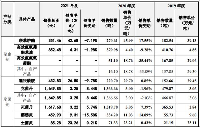 2019年至2021年,联苯肼酯的销售单价分别为39.13万元/吨、45.99万元/吨及42.68万元/吨;噻呋酰胺的销售单价分别为28.19万元/吨、29.45万元/吨及26.80万元/吨;萎锈灵的单价分别为9.60万元/吨、11.03万元/吨及9.31万元/吨。