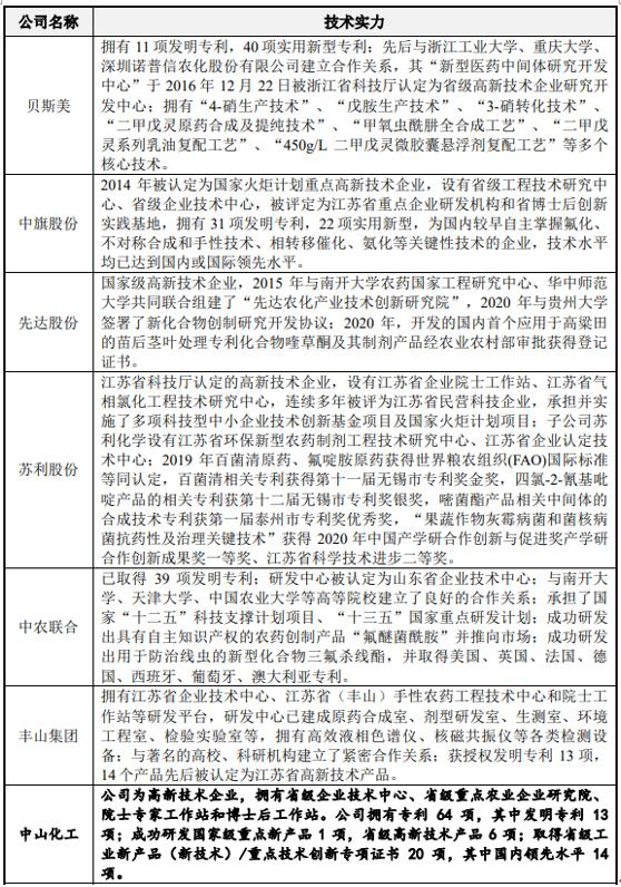 但与同行业可比公司相比,公司拥有的专利数量较少。同行业公司贝斯美拥有11项发明专利,40项实用新型专利;中旗股份拥有31项发明专利,22项实用新型;中农联合已取得39项发明专利;丰山集团获授权发明专利13项。