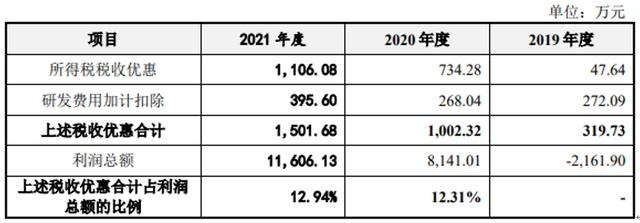 2020年及2021年,公司税收优惠合计1,002.32万元、1,501.68万元,占公司利润总额的比例分别12.31%及12.94%。