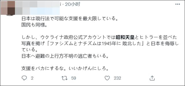 “日本正根据现行法律,最大限度地提供支援。日本国民也是一样。但是,乌克兰政府官方账号却刊登了昭和天皇和希特勒的照片,侮辱日本。不要愚弄你的支持者,请适可而止。”