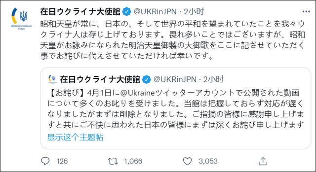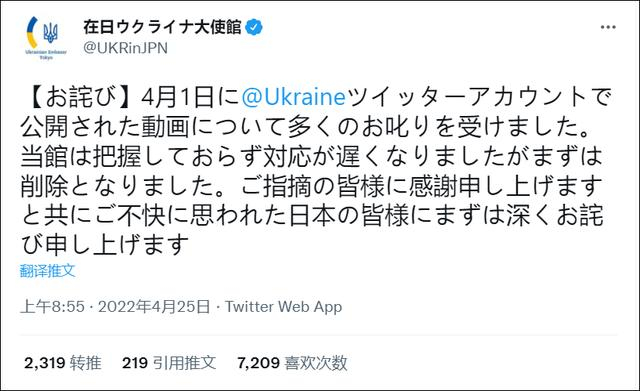 4月25日上午,乌克兰驻日本大使馆连发多条推特道歉灭火,称“本馆对此事应对迟缓,视频已经被删除。感谢各位的指正,向感到不快的日本人表示深深的歉意。”