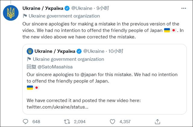 在引发日本网民众怒和日本政界人士不满后,涉事的乌克兰政府推特账号“Ukraine / Україна”在4月24日晚发布推特道歉,“对于在之前版本的视频中出现的错误,我们深表歉意。我们无意冒犯友好的日本人民。”