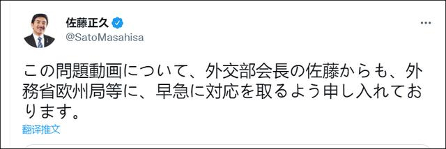 日本政界人士也纷纷发声表示不满。日本国会参议院议员、自民党外交部会会长佐藤正久发推称:“对于这个问题视频,已要求外务省欧洲事务局立即采取行动。”
