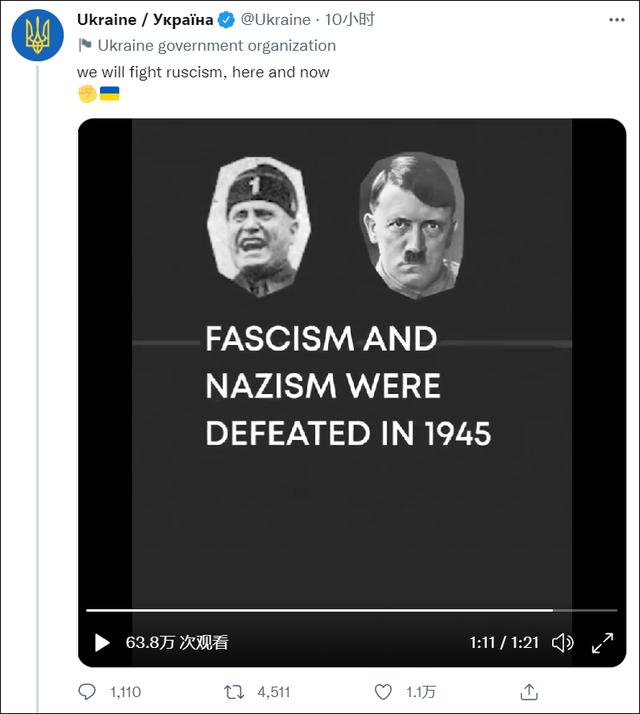 4月1日,该账号发布了一条反俄宣传视频,并且声称将与“俄罗斯主义(ruscism)”作斗争。视频1分11秒处,希特勒、墨索里尼和日本昭和天皇并排出现,这三人是二战时期三个法西斯轴心国的国家元首。视频配文道:“法西斯主义和纳粹在1945年被击败。”