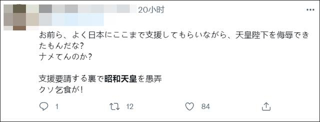 “你们在得到日本如此支援的情况下,居然还侮辱天皇陛下?表面请求支援背地里却嘲讽天皇,可恶的乞丐!”