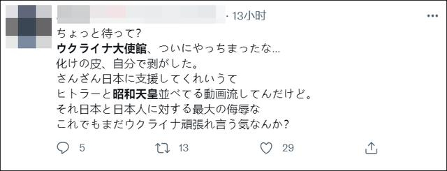 有人怒骂乌克兰忘恩负义:“乌克兰自己剥下了面具,一再要求日本的支援,却播放了把希特勒和日本昭和天皇放在一起的视频,这是对日本和日本人最大的侮辱。”