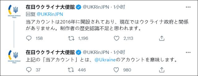 乌克兰驻日本大使馆还与涉事推特账号撇清关系,称“该账号开设于2016年,现在与乌克兰政府没有关系。看起来视频制作者对历史的认识不足。”