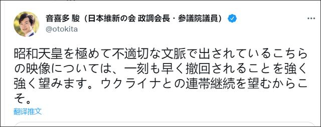 日本参议院议员音喜多骏则表示:“我强烈希望尽快撤下这段以极其不恰当的语境展示昭和天皇的视频。因为我想继续声援乌克兰。”