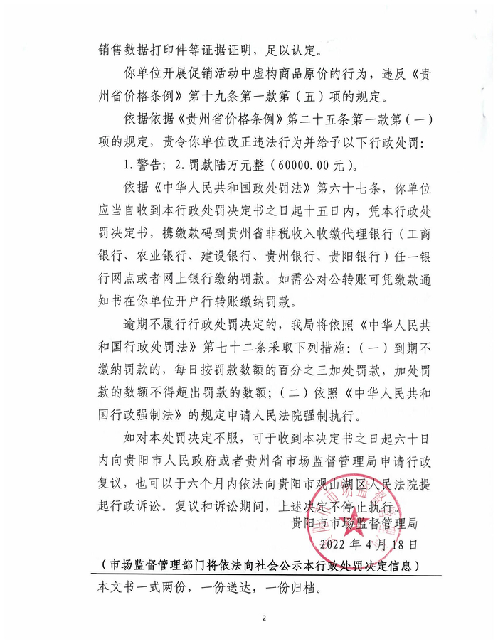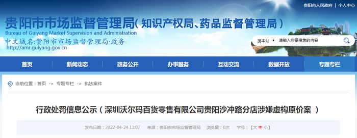 贵阳市市场监督管理局公示一起涉嫌虚构原价案行政处罚信息