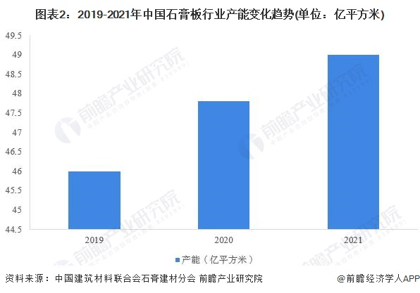 产能方面,据中国建筑材料联合会石膏建材分会统计数据显示,2019年以来,我国石膏板产能持续提升,到2021年,全国石膏板累计产能约为49亿平方米,同比增长2.51%。