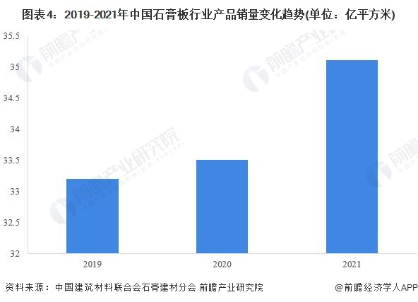 市场需求方面,近年来,随着我国房地产市场发展势头趋缓,我国石膏板产品需求增速有所放缓,2019-2020年,全国石膏板产量基本维持在33亿平方米左右,到2021年,全国石膏板产量提升至35.1亿平方米,同比增长4.8%。