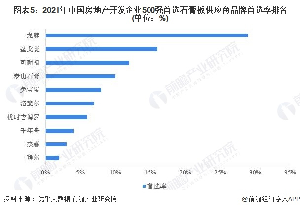 具体到品牌来看,目前北新建材旗下石膏板产品在国内市场最受欢迎,据优采大数据调研数据显示,2021年,房地产开发企业500强首选石膏板供应商品牌首选率排名中,北新建材旗下“龙牌”和“泰山”系列产品首选率分别为29%和10%,分别排名第一和第四位。