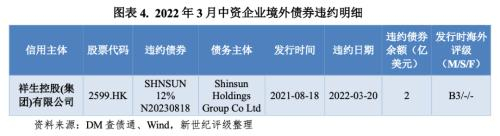 2022年3月,中资企业新增境外美元债违约主体1家,为祥生控股(集团)有限公司(简称“祥生控股”,股票代码:2599.HK),违约债券为2亿美元“SHNSUN 12% N20230818”(ISIN代码:XS2369849745)。包括该支债券在内,祥生控股目前存续美元债共4支,本金余额共6.2亿元;其境内发债主体仅存续1支5亿元非公开发行公司债券“20祥生01”,票面利率7.7%,将于2023年3月2日到期。
