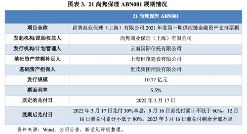 3月17日,由于预计基础资产所涉应收账款实现不及预期,“21尚隽保理ABN001”持有人会议审议通过展期议案。该支资产支持票据原应于3月17日兑付资产支持票据利息和本金,展期后3月17日兑付不低于资产支持票据优先级本金的30%(即3.072亿元)及其对应期间的资产支持票据利息,剩余本金分批次分别展期6个月、9个月和1年。