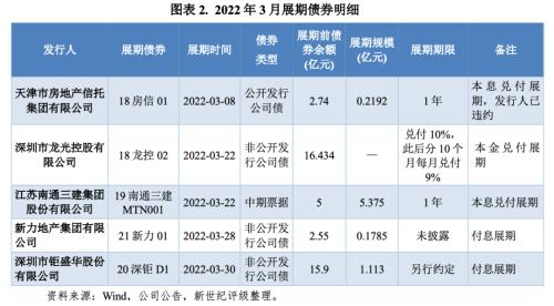 除违约债券之外,2022年3月债券市场共有5家发行人的5支债券展期,展期前债券余额共44.45亿元,展期金额共39.22亿元。在本月展期主体中,深圳市龙光控股有限公司为本月首次发生债券展期,天津市房地产信托集团有限公司其他债券已于2020年8月发生违约,其余3家均为往期已发生债券展期的发行人。