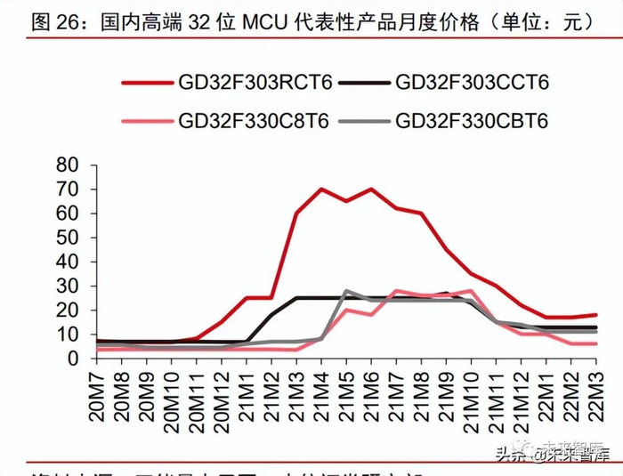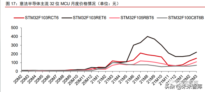 渠道端:渠道价格是实际供需错配的放大器,2022Q1 再涨价表明下游需求提升。MCU 渠道价格、交期指由经销商向终端厂商出货时的价格、交期,是跟踪 MCU 行业景气度的 核心指标之一,其由下游终端需求强度以及发货物流情况决定,同时也受到上游 MCU 原 厂供给情况影响。我们以意法半导体(如 STM32F103RCT6、STM32F103RET6 等)、兆 易创新(如 GD32F103VCT6、GD32F103RBT6 等)主流 MCU 产品月度价格、海外 MCU 原厂季度交期的波动情况追踪 MCU 渠道的整体趋势,纵向分析不同时期 MCU 渠道价格、 交期的变动: