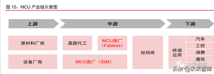 我们详细梳理了 MCU 原厂端及渠道端的价格及交期以及供需两端的制造扩产和整车 需求,整体来看,全球汽车 MCU 供货紧缺持续,国内厂商有望借机导入整车厂供应链并 逐步提升份额。从 MCU 产业链来看,原厂位于中游位置,上游主要有原材料厂商、设备 厂商等,Fabless 型相比 IDM 型额外需要晶圆代工厂商支持,下游通过经销商向终端应用 分散,包括汽车、工控、消费、通信等不同领域。