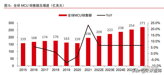 全球 MCU 市场中,汽车 MCU 销售额为 76 亿美元,约占 39%,另外 46%来自通用嵌入式应用 MCU(包括智能手机、计算机和外围设备、工业用途和消费产品),其 余来自智能卡市场(银行卡、公交卡、身份证等)及其他用途。未来五年,汽车 MCU 销 售额预计将以 7.7%的复合年增长率增长,稍快于 MCU 行业增速,至 2026 年销售额将增 长至110 亿美元。