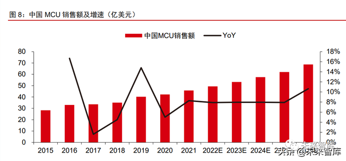 中国 MCU 市场规模尚小,汽车 MCU 占比较低。根据前瞻产业研究院,2021 年中国 MCU 销售额(本文中如未作特殊说明,中国 MCU 销售额指国内生产的 MCU 销售额)达 到 46 亿美元,同比增加 8.3%,全球占比 23.3%,未来 5 年 CAGR 预计为 8.5%,2026 年销售额将达到 69 亿美元,全球占比提升至 24.8%。中国 MCU 市场中,汽车 MCU 销售 额为 6.8 亿美元,约占 15%。未来五年,汽车 MCU 销售额预计将以 5.3%的复合年增长率 增长,至 2026 年销售额将增长至 8.8 亿美元。