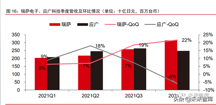从两者季度营收 环比数据来看:1)2021H1,两家企业营收均环比增长且应广科技增幅更大,反映消费供 需更为紧张:由于 MCU 上游供给与下游需求严重不匹配,推动原厂产品量价齐升,瑞萨 电子、应广科技月度营收均呈环比增长,瑞萨电子 2021Q1/Q2 营收分别环比+6%/+7%, 应广科技 2021Q1/Q2 营收分别环比+9%/+18%,反映下游快速复苏且消费电子市场增速 高于汽车、工控等市场。2)2021H2,瑞萨电子营收持续环比大幅提升,应广科技营收出 现环比下滑,反映汽车供需紧张仍持续:瑞萨电子2021Q3/Q4营收分别环比+19%/+22%, 应广科技 2021Q3/Q4 营收分别环比+7%/-6%,说明下游应用中消费电子需求表现疲软, 导致应广科技营收环比下行;汽车电子、工控等领域需求持续上行,瑞萨电子业绩环比快 速提升。