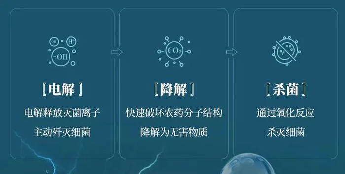 通过电解、降解、杀菌三步骤对致病微生物起到生物杀灭作用,或是让它们变成无害物质。