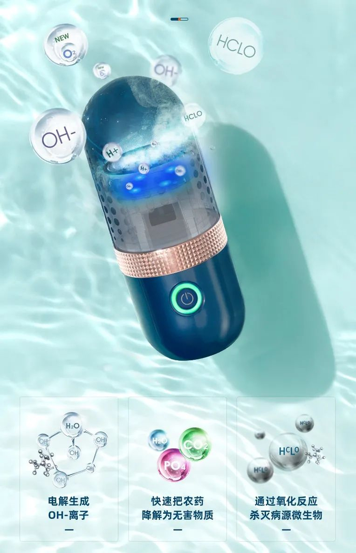 因为要投入水中使用,这款胶囊果蔬净化器的的防水等级为IPX7防水等级。机身结构防浸泡、防渗漏,而且采用的是5V直流电,无强电接;采用的钛电极也安全稳定,使用时也不担心漏电,净化器处于工作状态下也能放心伸手进水中拿取食物,使用起来让人安心。