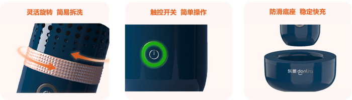整个机器小巧玲珑,旋转灵活、方便清洗、触控开关,操作简单。防滑底座,即放即充。