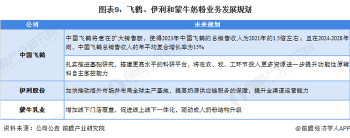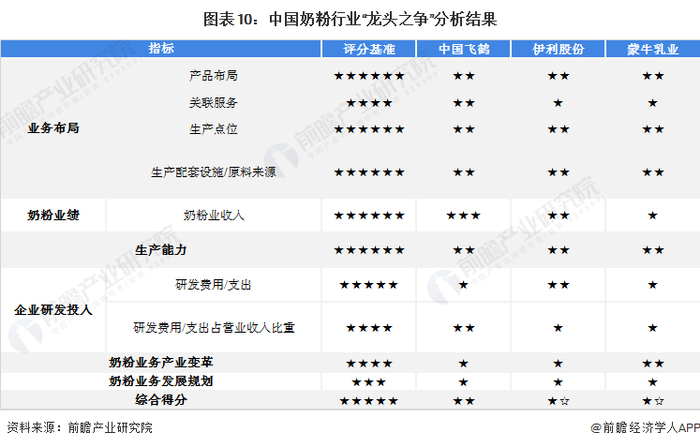 在奶粉行业中,奶粉产品布局、关联服务、生产点位和生产配套设施/原料来源均为行业中较为重要的部分,奶粉业绩能反应公司的经营概况,生产能力能反映企业产品供应保证能力,企业研发投入、产业变革和发展规划则能反映企业未来的发展走向概况。基于前文分析结果,前瞻认为,中国飞鹤因在奶粉奶粉关联服务、奶粉业务收入和研发创新方面占有优势,目前是我国奶粉行业上市企业中的“龙头”。