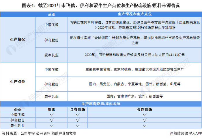 从三者的生产情况和生产点位来看,三者生产状况不分伯仲,均在国内国外有所布局生产点位。从生产配套设施和原料来源来看,三者均备有自有物流、自由牧场和合作牧场,但三者的产量情况或有一定的差别。
