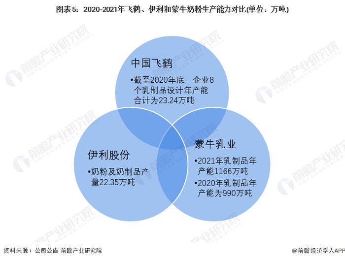 2020年,中国飞鹤的设计年产能合计为23.24万吨,伊利股份的奶粉及奶制品产量为22.35万吨;虽蒙牛在2020年的乳制品年产能共计990万吨,但蒙牛的奶粉业务占比不足6%,故三者在生产能力上或较为均衡。