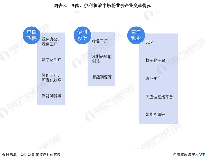 从产业变革走向来来看,三者因奶粉行业对食品安全的要求的特殊性,均已较早且持续跟进溯源系统的开发和迭代;不仅如此,三者亦同样相应低碳和绿色制造业的发展号召,发展绿色工厂。值得注意的是,飞鹤奶粉推出了可视化牧场的功能,更是为消费者打造的更加完善的品质保证功能。