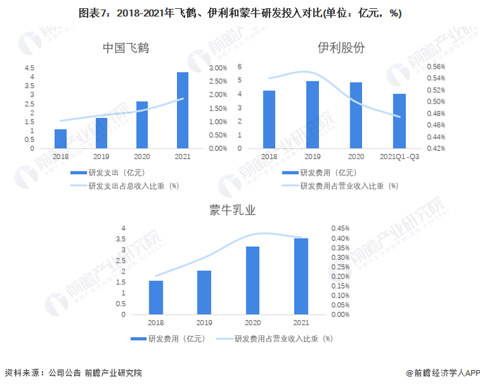 从研发费用/研发支出来看,2018-2020年,三者的排名为伊利>蒙牛>飞鹤。但从研发费用/支出占收入比重来看,2018-2020年,三者的排名为飞鹤>伊利>蒙牛。